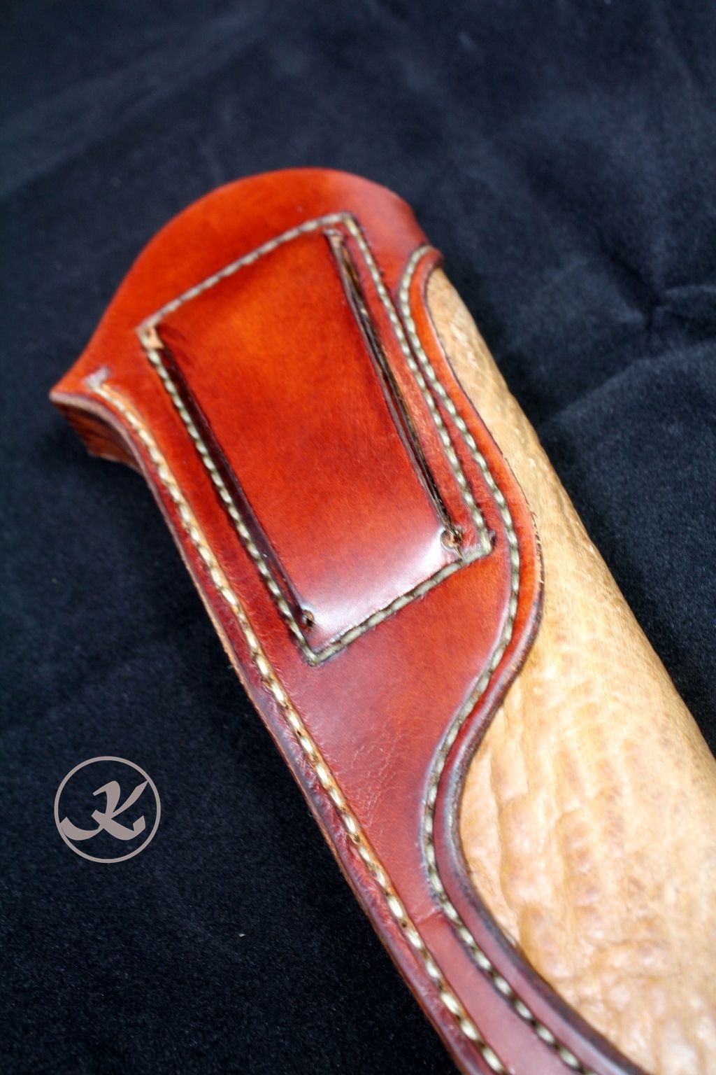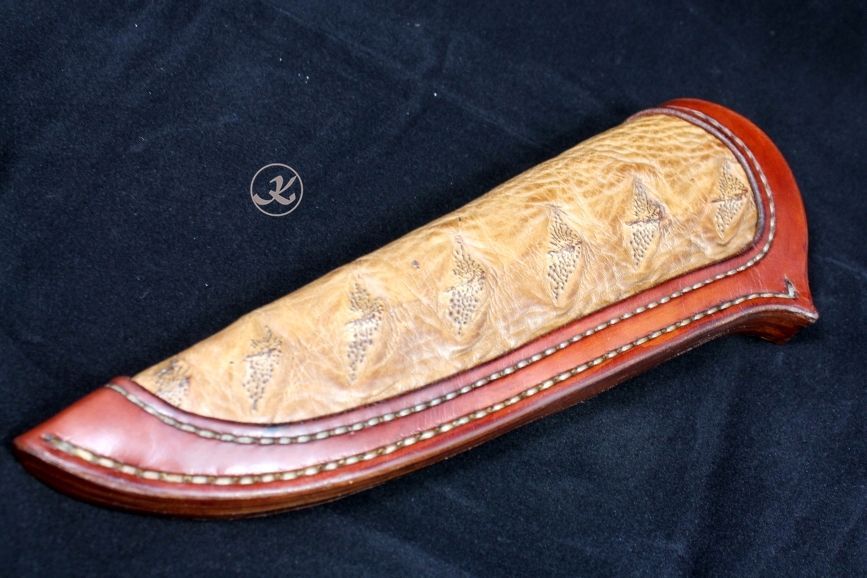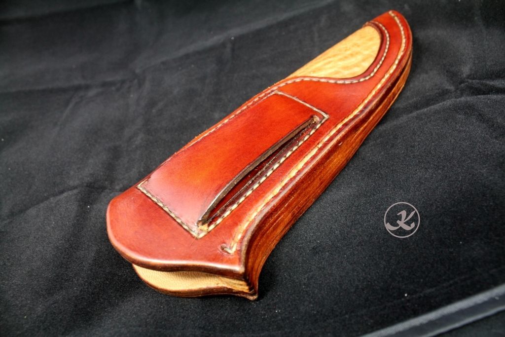 Messerscheide: links zu tragen aus Blankleder mit Einlage aus Störleder und Futter aus Kalbsleder
