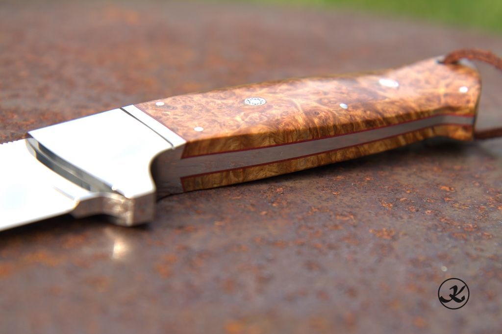 Griff: stabilisiertes Amboina AAA unterlegt mit 0,5mm rotem VulkanfiberMosaik Pin´s und EdelstahlstifteÖse: