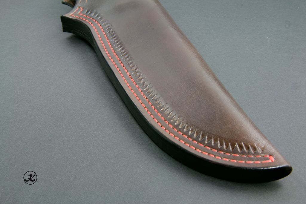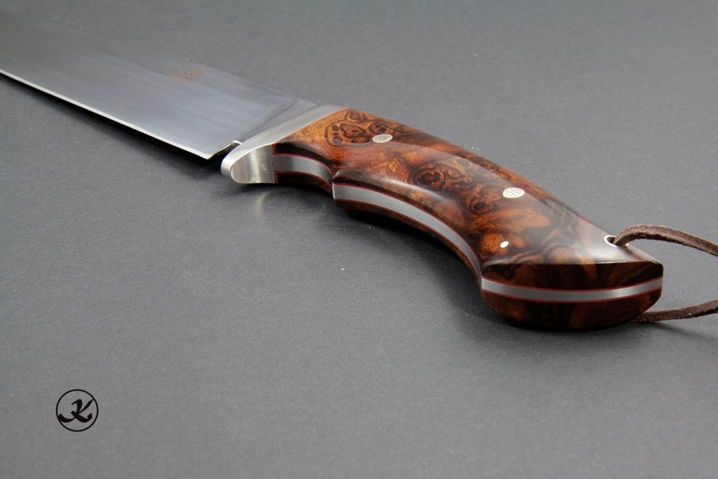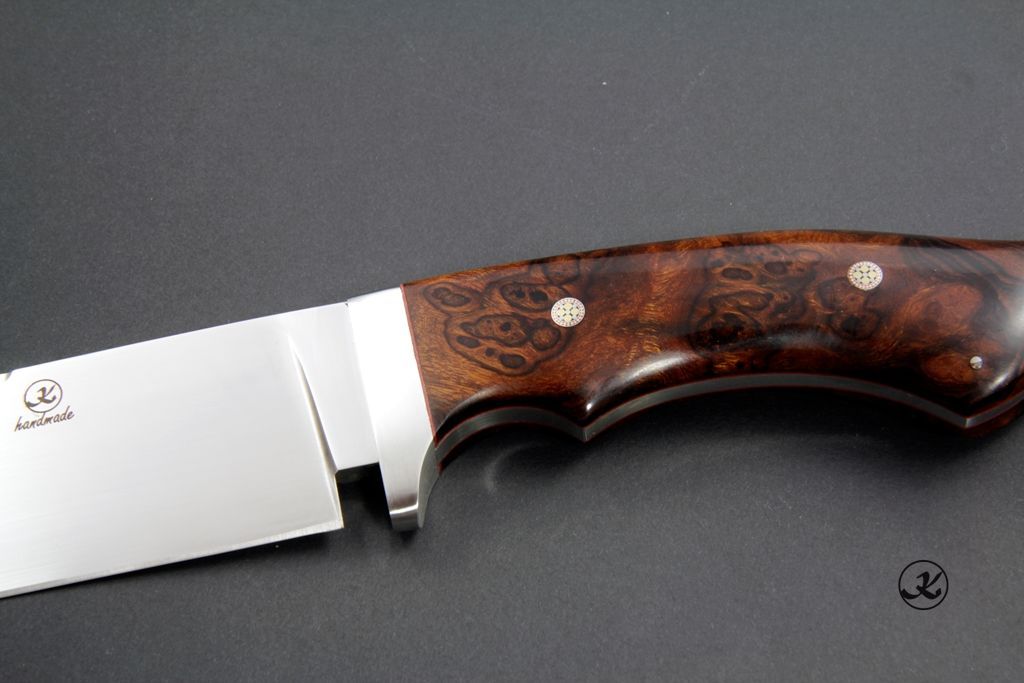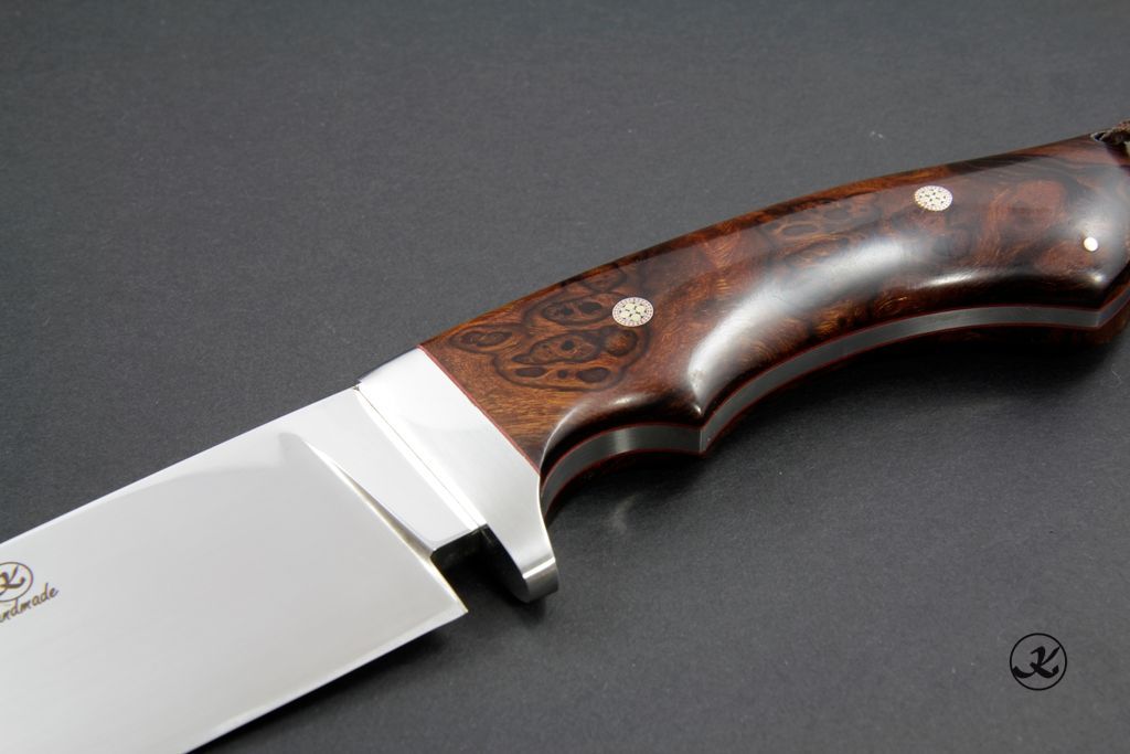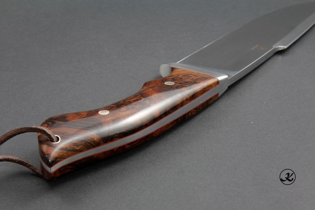 Griff: Wüsteneisenholz mit rotem Fiber hinterlegtBacken, Mosaikpin und Öse aus Edelstahl