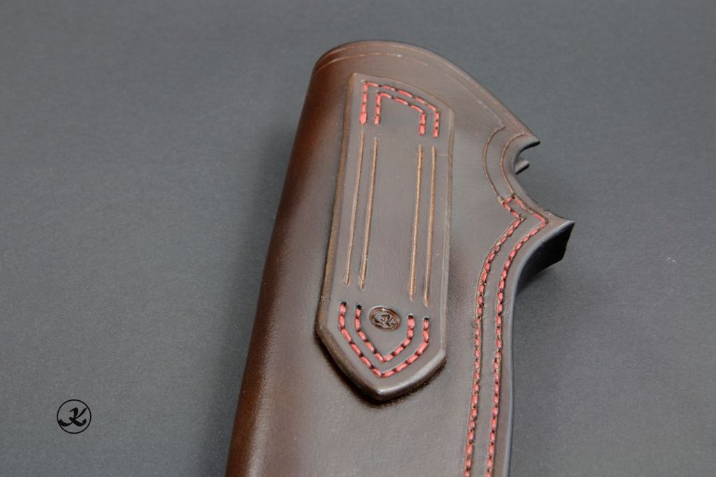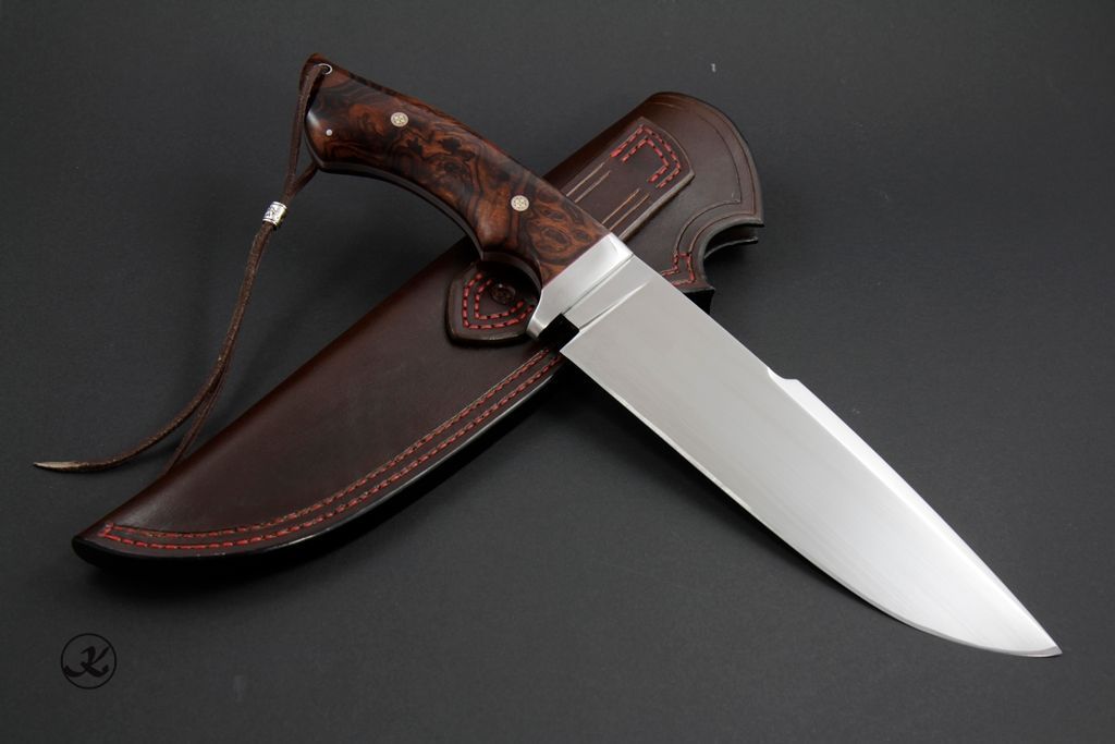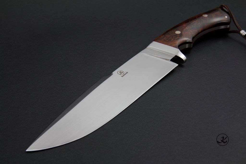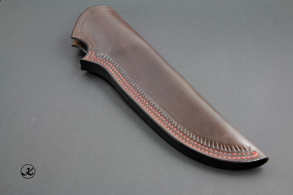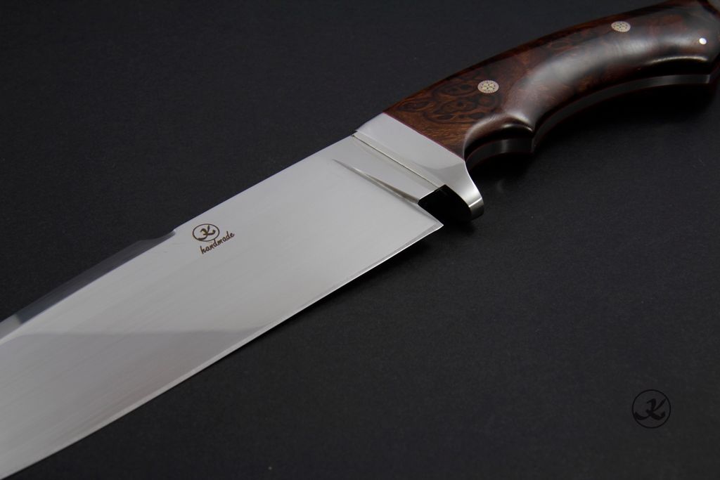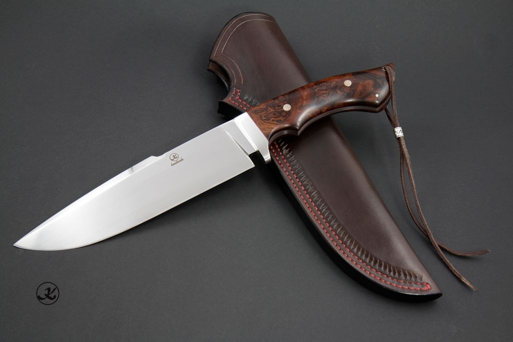 Griff: Wüsteneisenholz mit rotem Fiber hinterlegtBacken, Mosaikpin und Öse aus Edelstahl