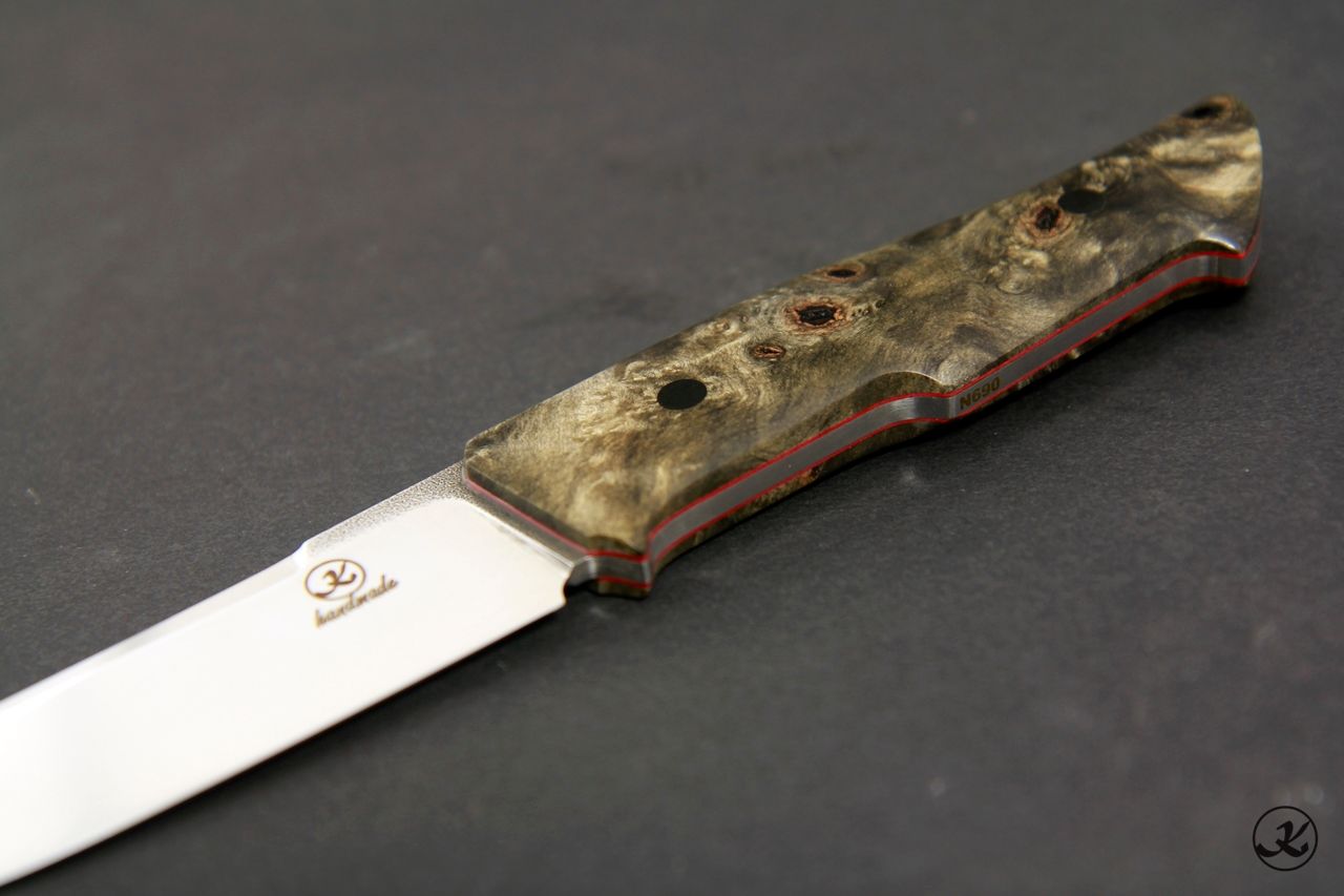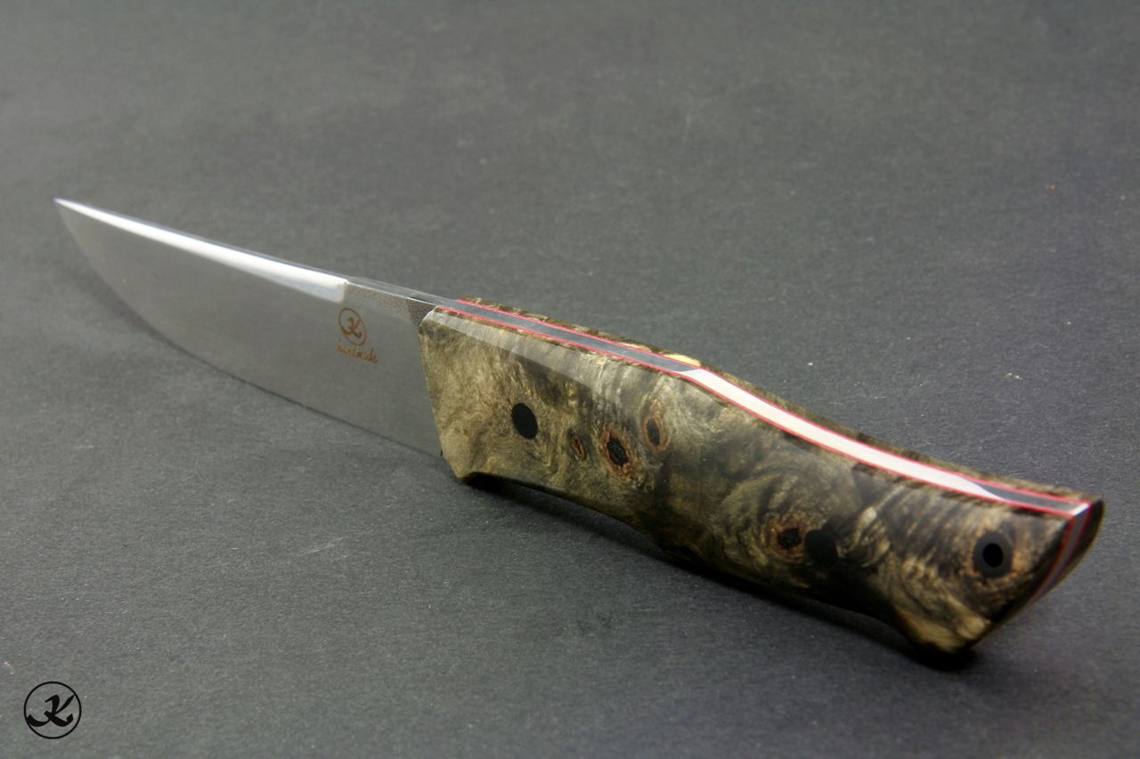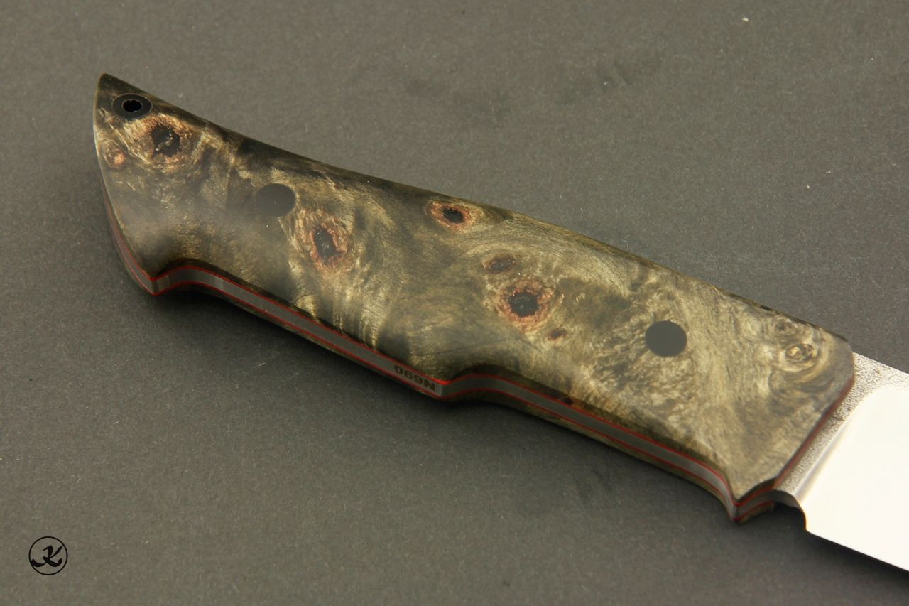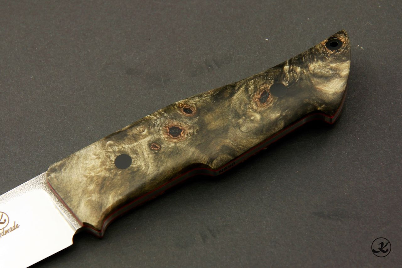 Griff: Buckeye Burl stabilisiertmit rotem Vulkanfiber hinterlegt. Pin und Öse aus Kohlefaser