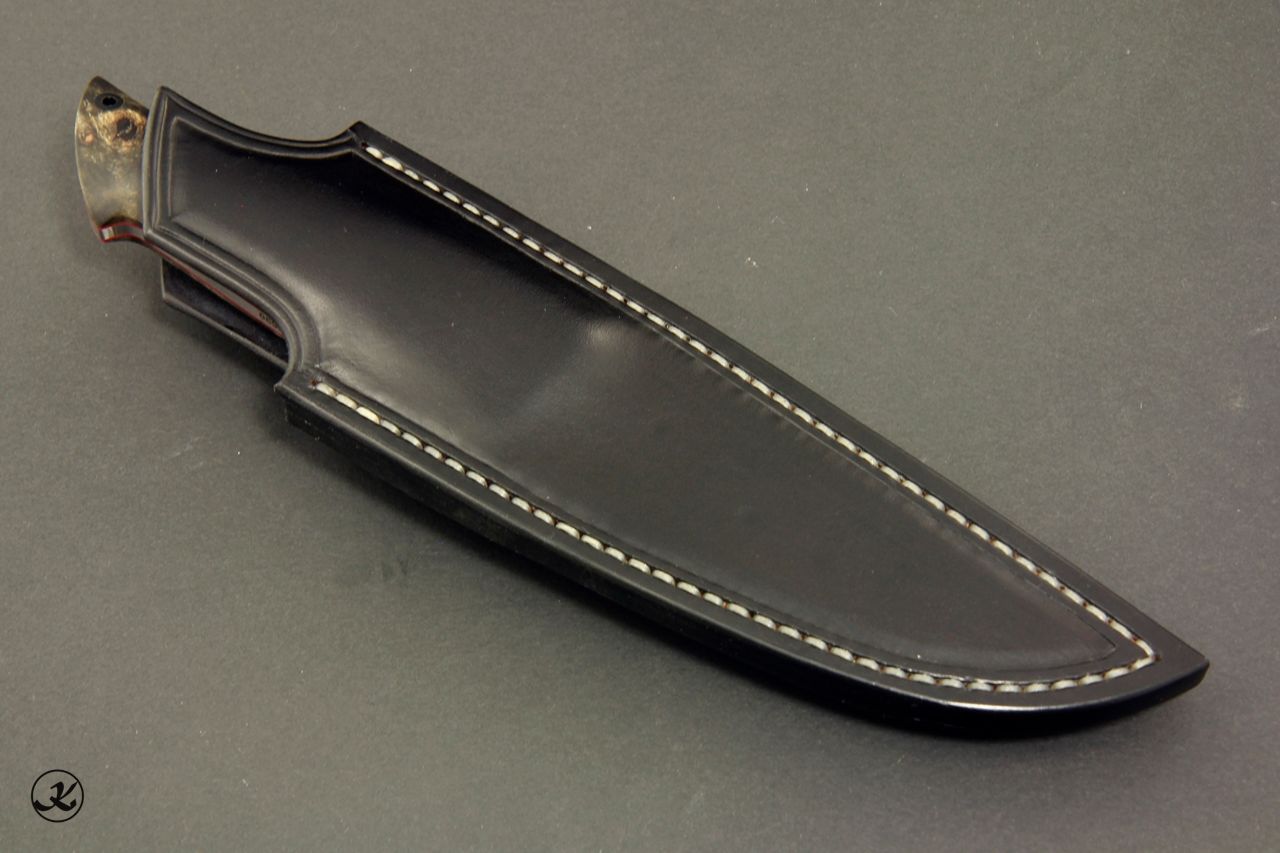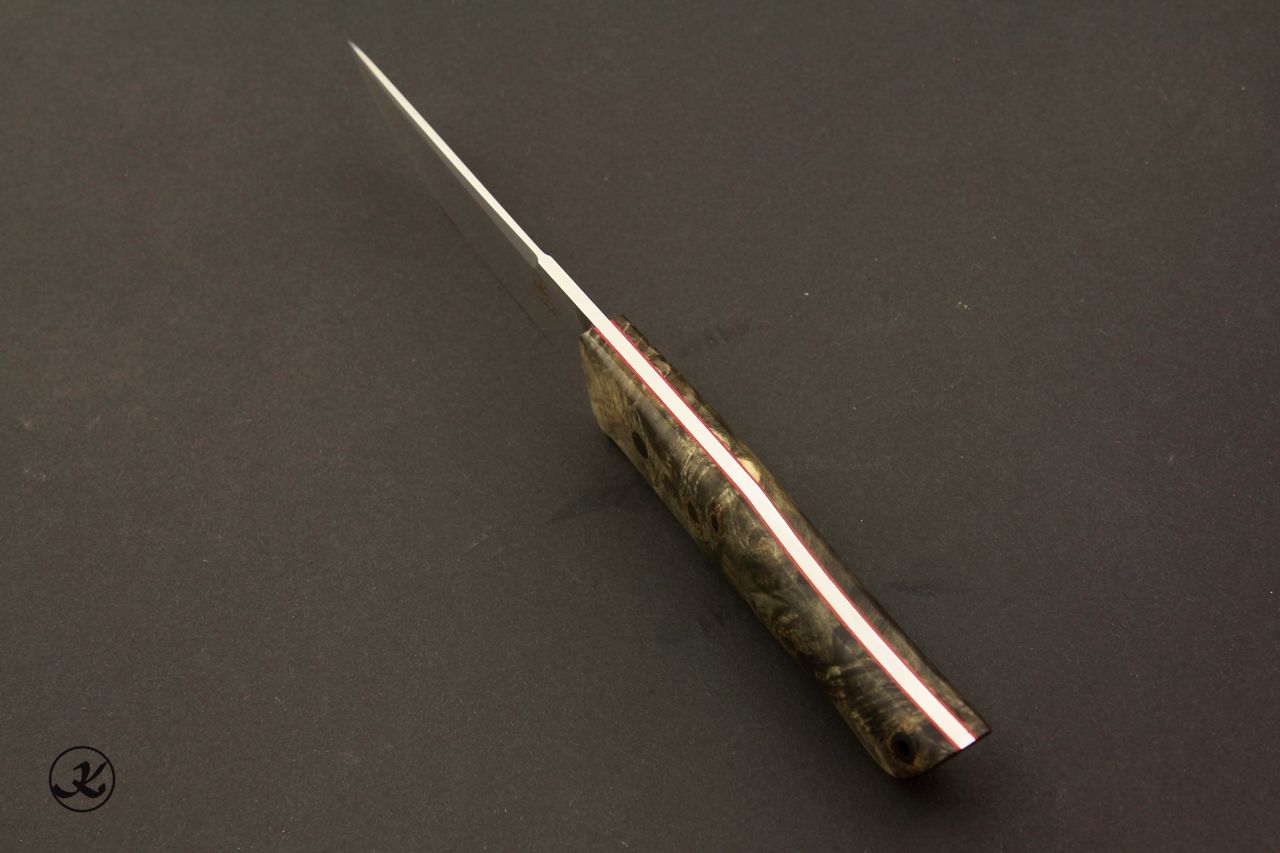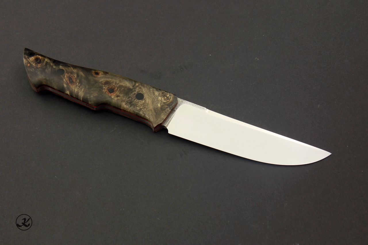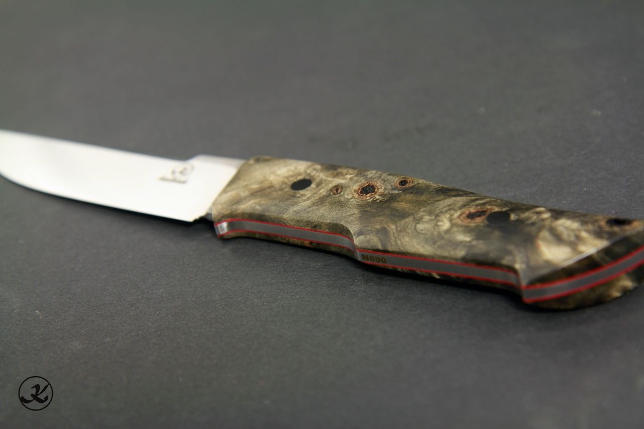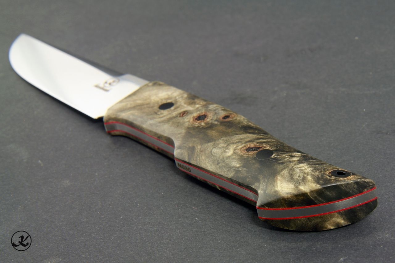 Griff: Buckeye Burl stabilisiertmit rotem Vulkanfiber hinterlegt. Pin und Öse aus Kohlefaser