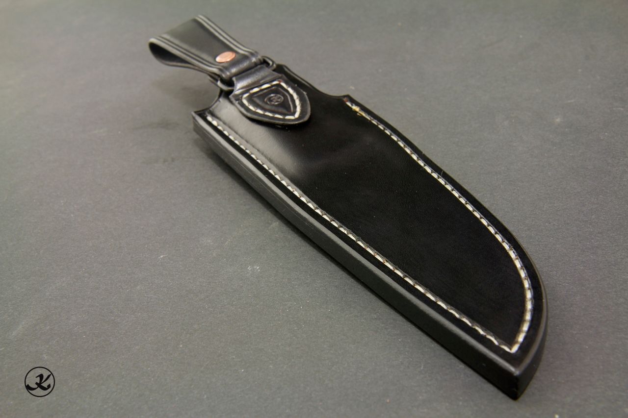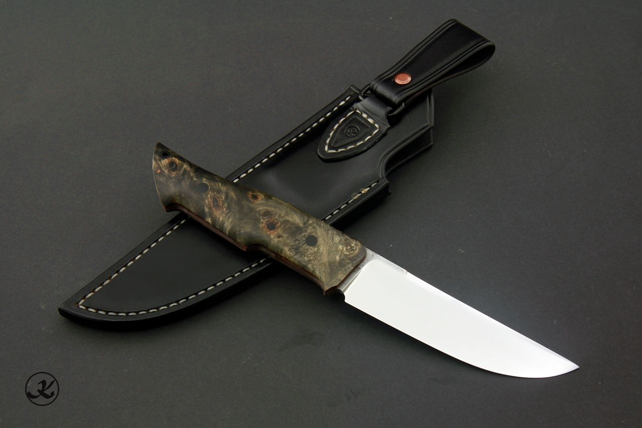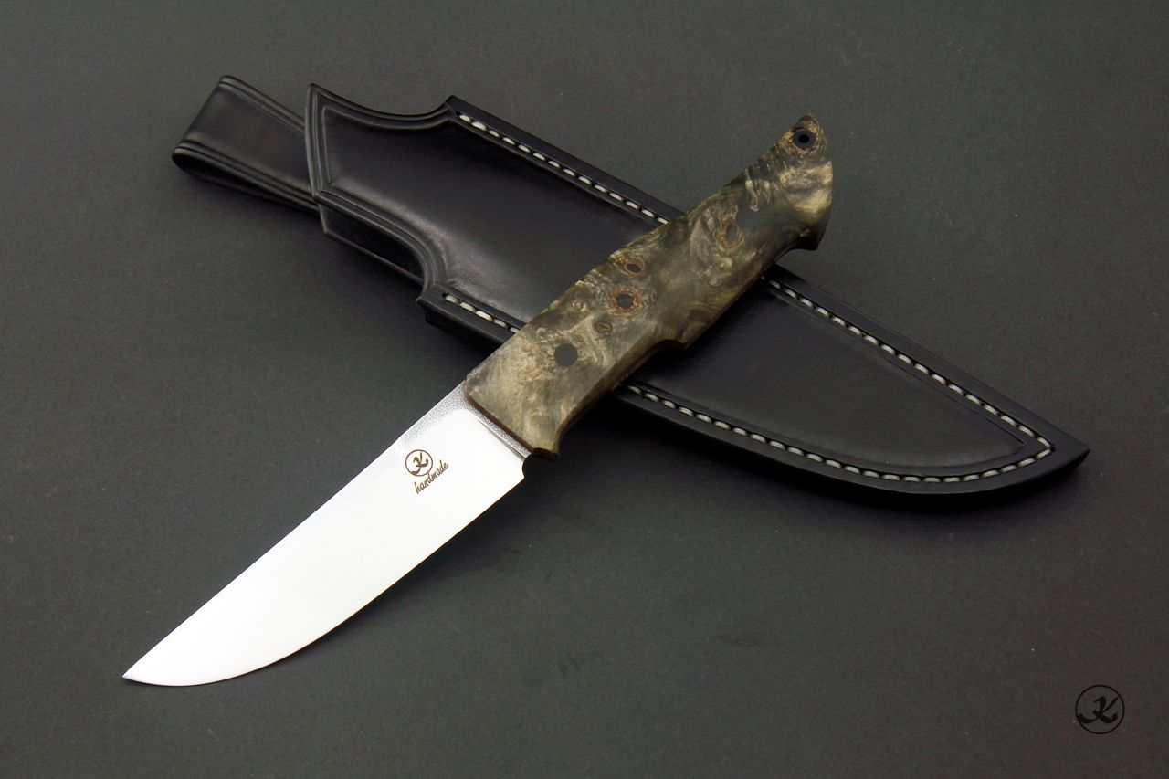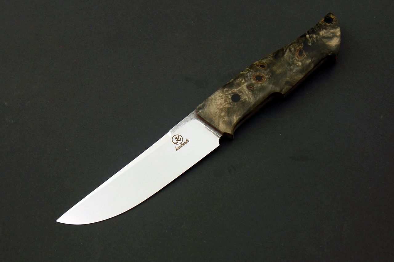Griff: Buckeye Burl stabilisiertmit rotem Vulkanfiber hinterlegt. Pin und Öse aus Kohlefaser